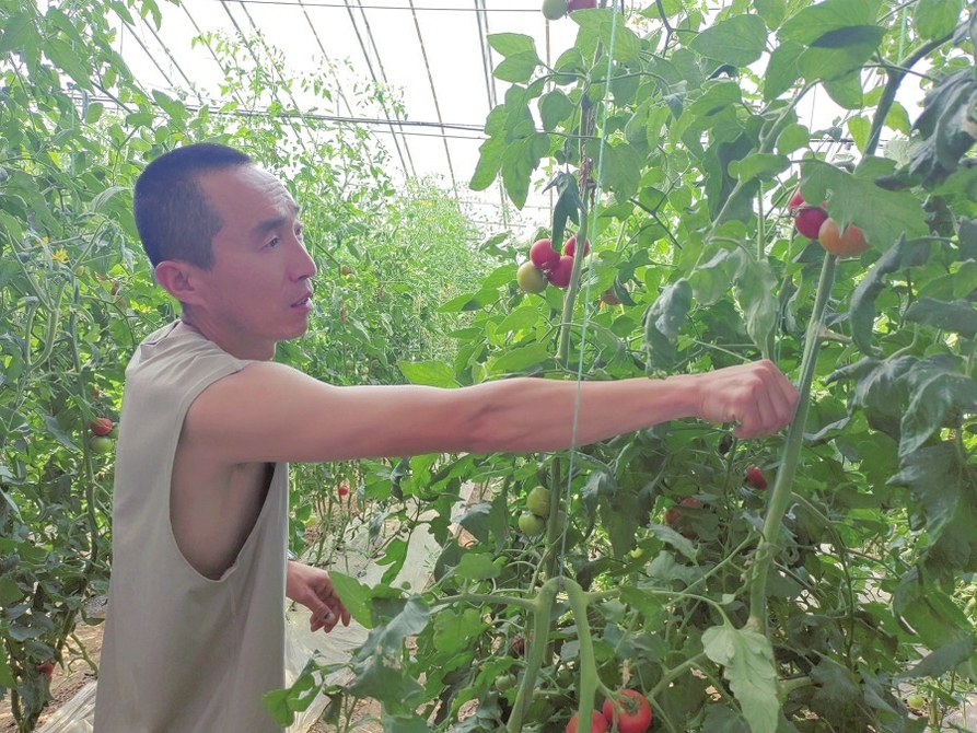 5月21日,杨房村千亩城郊现代农业示范区智慧大棚,夏晓飞在给西红柿打杈。高桦摄