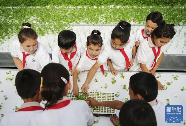在新疆阿克苏地区库车市甬库同心村智慧农业植物工厂,工作人员为当地小学生讲解无土栽培技术。